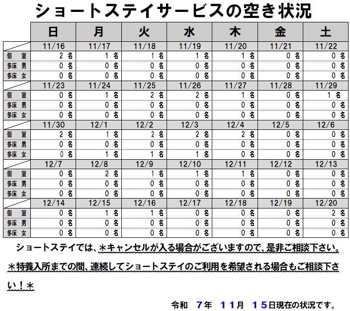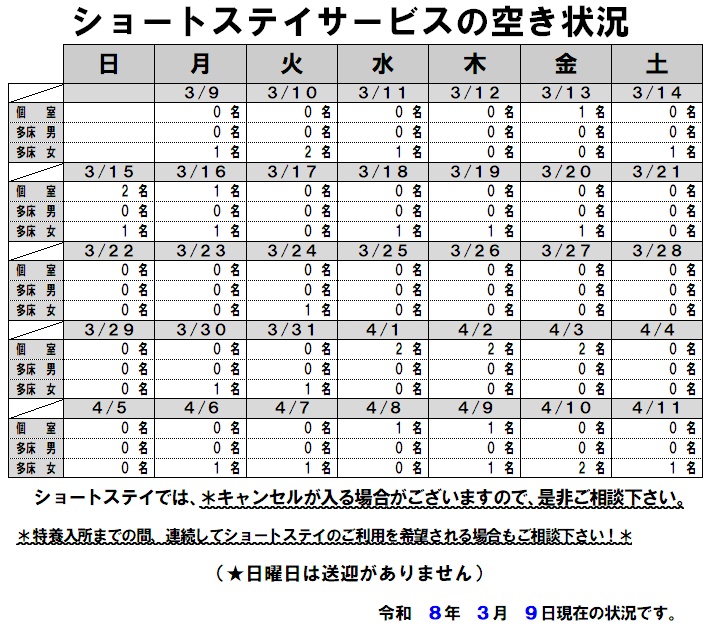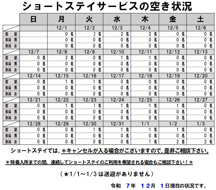 | ショートステイ | 1日分:300円~4,452円(別途いただく費用はありません) |