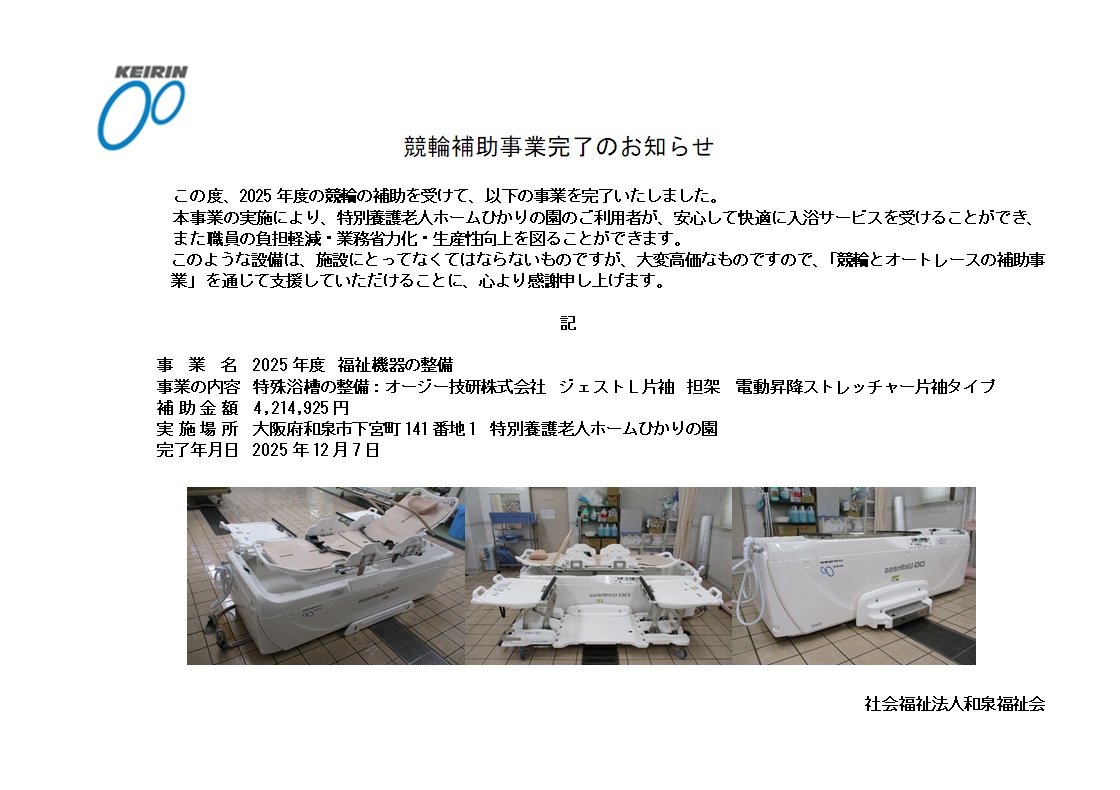 和泉市の南部、関西トランスウェイ スポーツスタジアムの隣に特別養護老人ホームひかりの園があります。