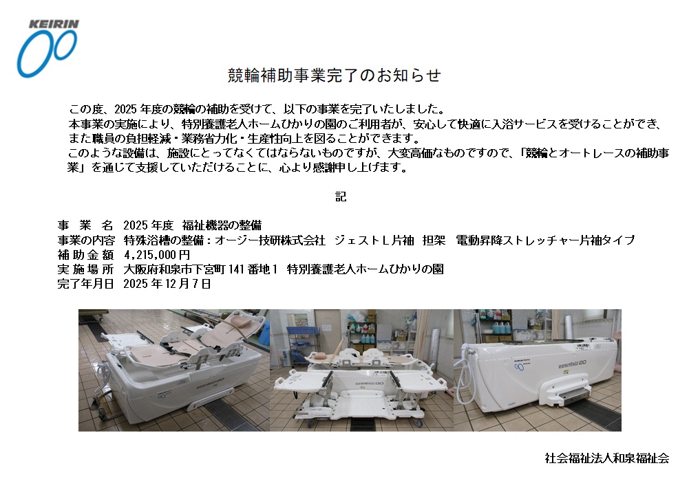 和泉市の南部、関西トランスウェイ スポーツスタジアムの隣に特別養護老人ホームひかりの園があります。